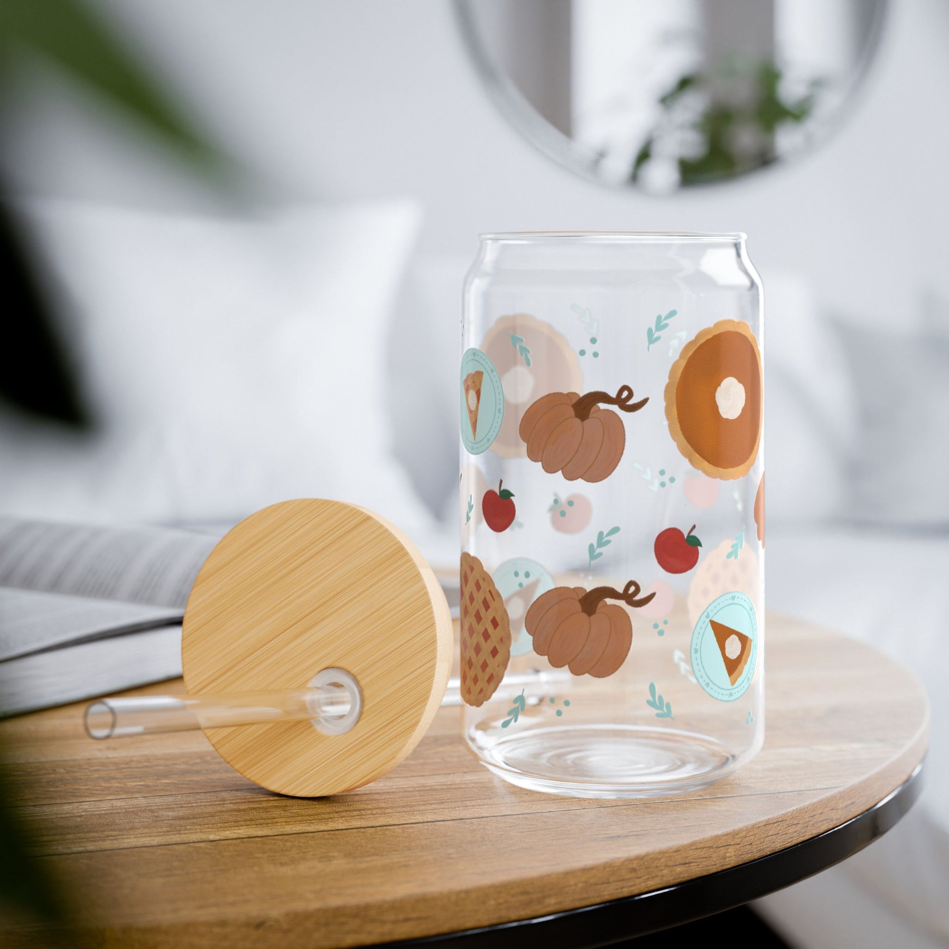 Celebrate the flavors of fall with this charming 16 oz glass can cup, wrapped in a cozy design featuring pumpkin pies, lattice apple pies, plump pumpkins, and crisp red apples. With its warm and festive illustration, this cup, brings the comfort of homemade autumn kitchen to every sip. Perfect for seasonal drinks, holiday, gatherings, or simply enjoying your daily coffee with a touch of fall magic. Ideal for fall lovers, pie enthusiasts, and cozy kitchen vibes.
