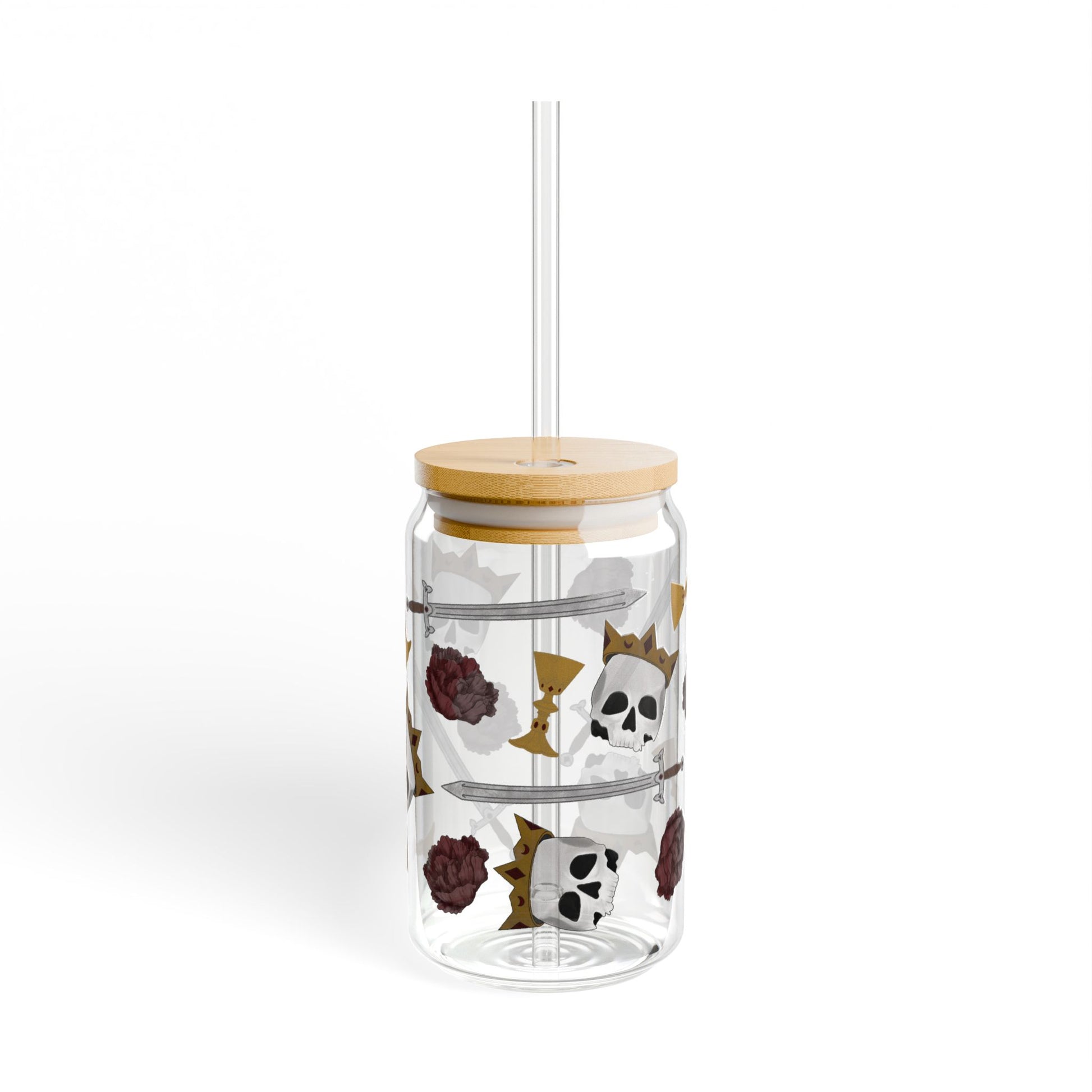 Sip like royalty with a twist of darkness. This 16 oz glass can cup features a striking design of crowned skulls, deep red roses, and golden goblet- perfect for the bold, the rebellious, and the unapologetically dramatic.