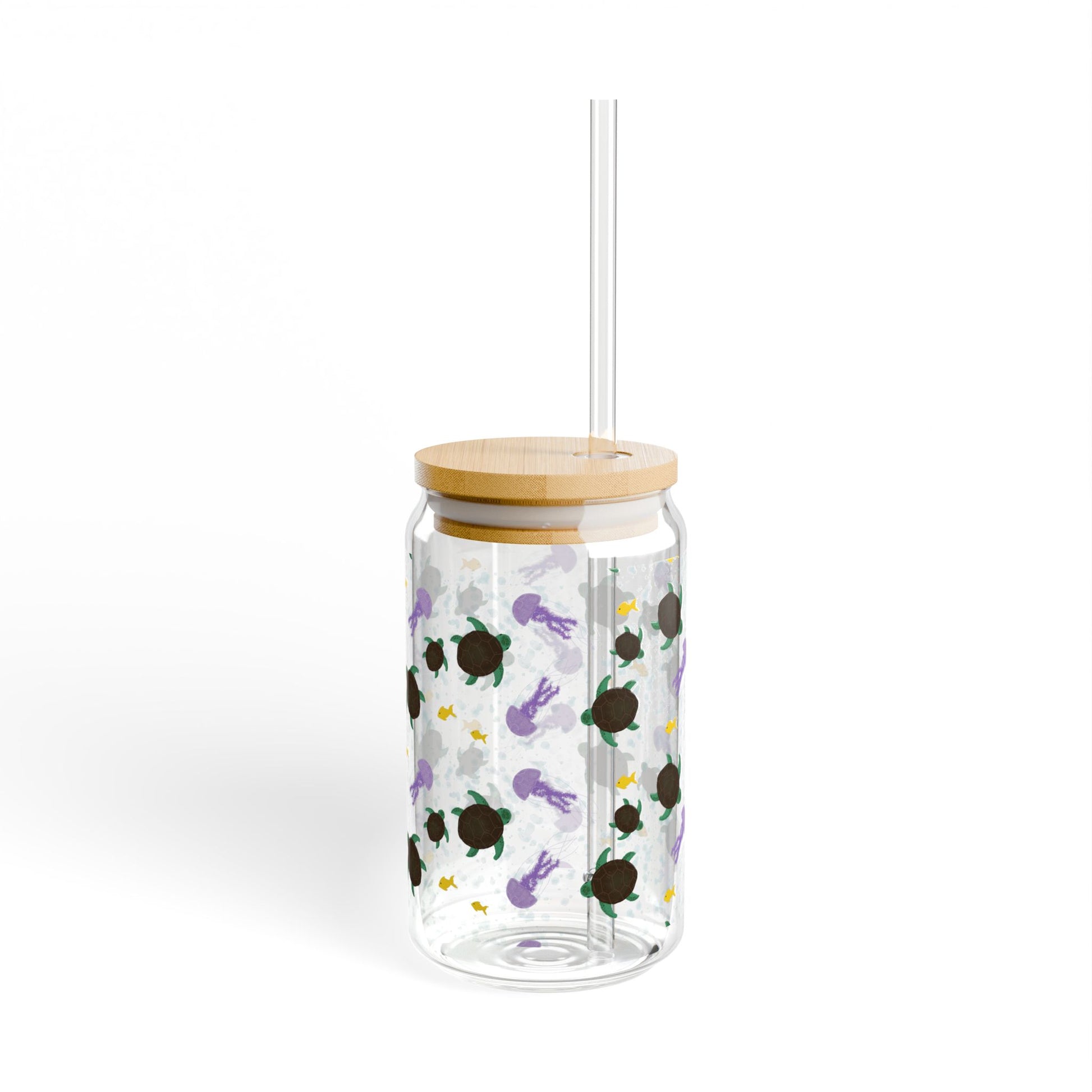 Dive into your day with a splash of ocean magic! This 16 oz glass can cup features an enchanting underwater scene of graceful sea turtles, tiny yellow fish, and floating purple moon jellyfish- a dreamy combo for marine lovers and mermaid hearts alike.